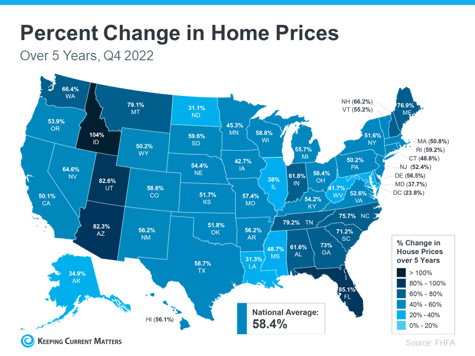 While that’s the national number, if you want to know what happened in your area, look at the map below from the Federal Housing Finance Agency (FHFA). It shows on average how much home prices have risen over the past five years, which has been a major driver behind equity growth.